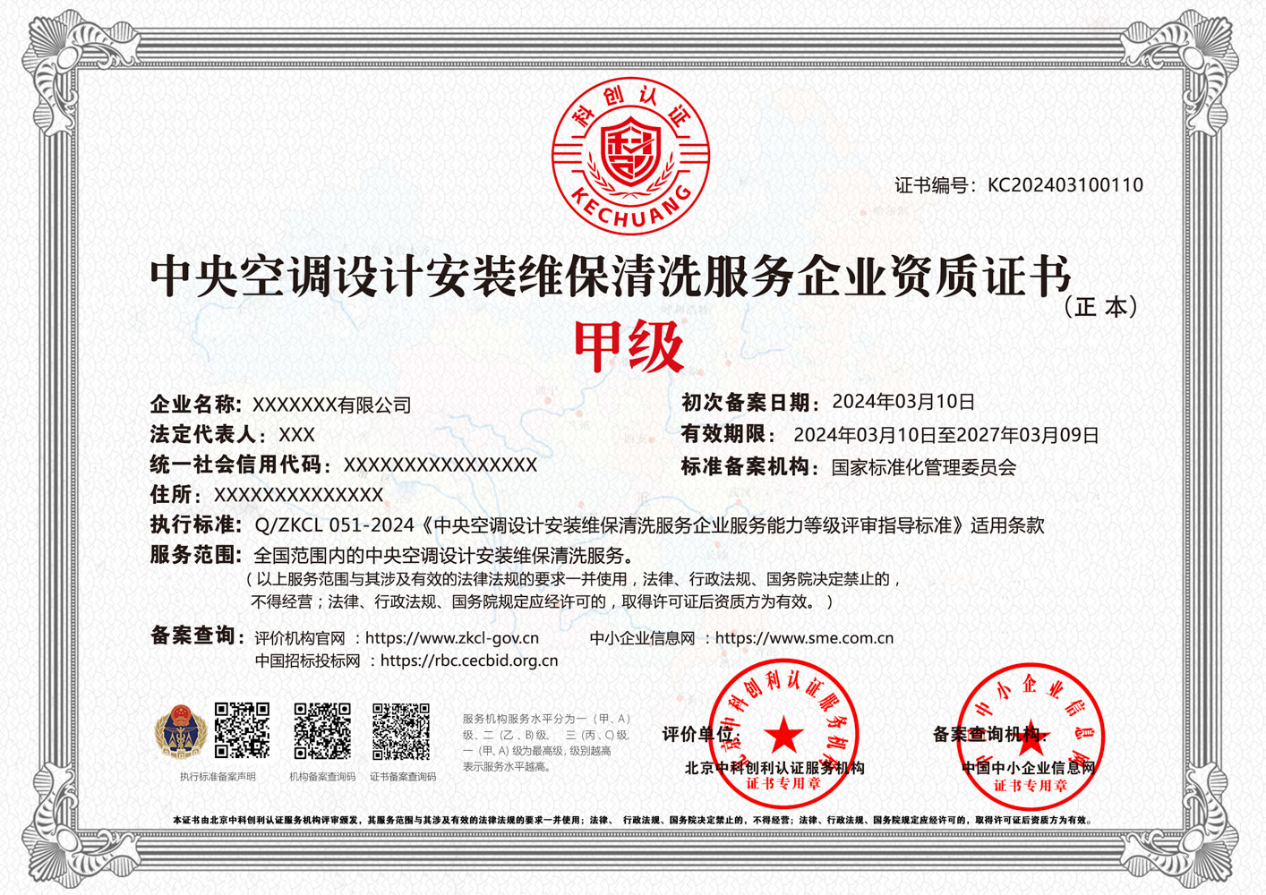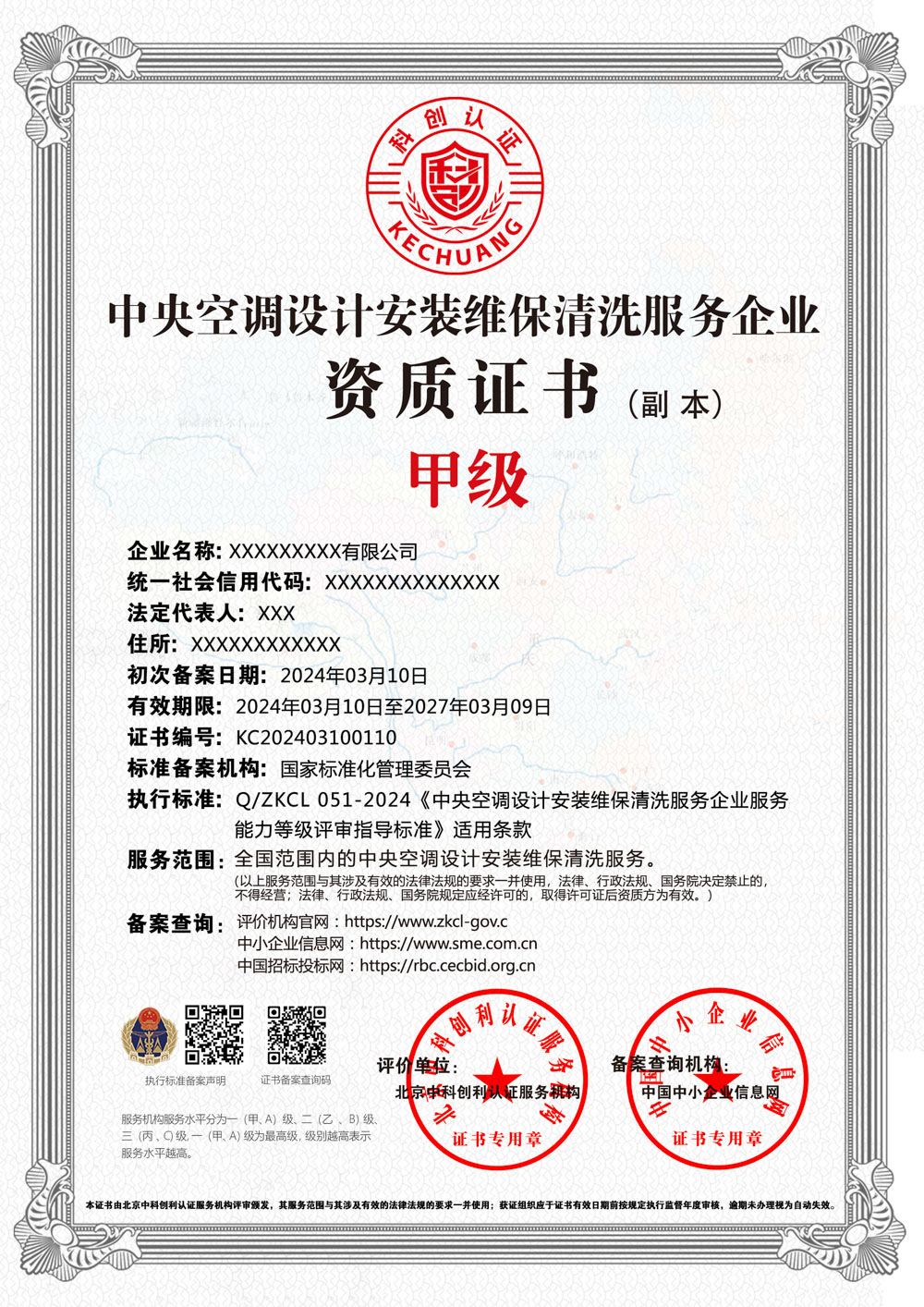 中央空调设计安装维保清洗服务企业资质证书